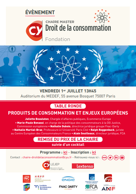 L’événement organisé par la Chaire-Droit de la consommation, se déroulera le vendredi 1er juillet 2022 (à partir de 13h45) dans l’auditorium du MEDEF (55 avenue Bosquet, 75007 Paris) sur le thème « Produits de consommation et enjeux européens », premier événement public de la Chaire qui se tiendra en présentiel !